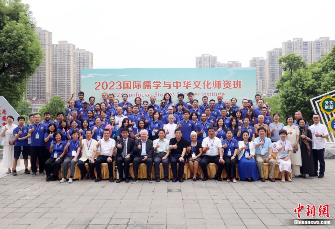 2023年8月14日,與會(huì)嘉賓和學(xué)院在活動(dòng)現(xiàn)場(chǎng)合影。當(dāng)日,由北京外國(guó)語(yǔ)大學(xué)與國(guó)際儒學(xué)聯(lián)合會(huì)聯(lián)合主辦的“2023國(guó)際儒學(xué)與中華文化師資班”開班儀式在江蘇省丹陽(yáng)市舉行,來自20多個(gè)國(guó)家和地區(qū)的120名學(xué)員,參加為期13天的中華傳統(tǒng)文化研修。李國(guó)慶 攝