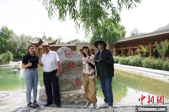 圖為青海省海東市循化縣撒拉族歷史文化地標駱駝泉內(nèi),唐一泓(左一)和當?shù)刂v解員合影留念。 馬銘言 攝