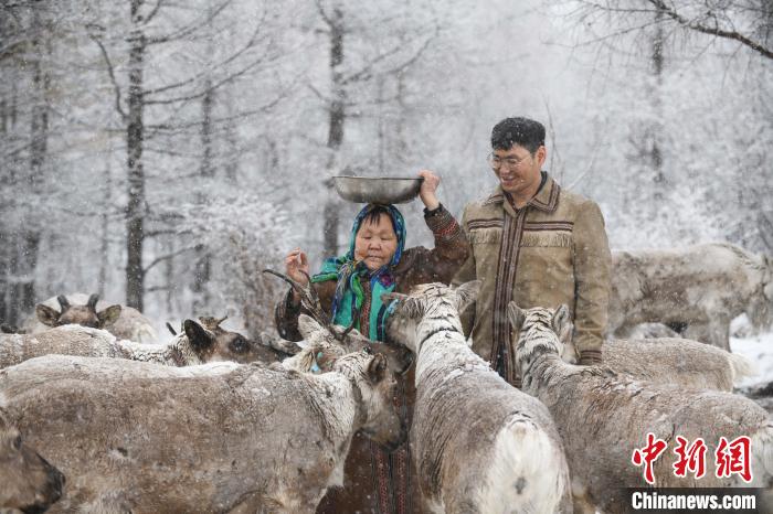 資料圖。圖為2023年4月29日,在內(nèi)蒙古大興安嶺,柳霞與兒子雨果在雪中給馴鹿喂食豆餅?!⊥鮽?攝