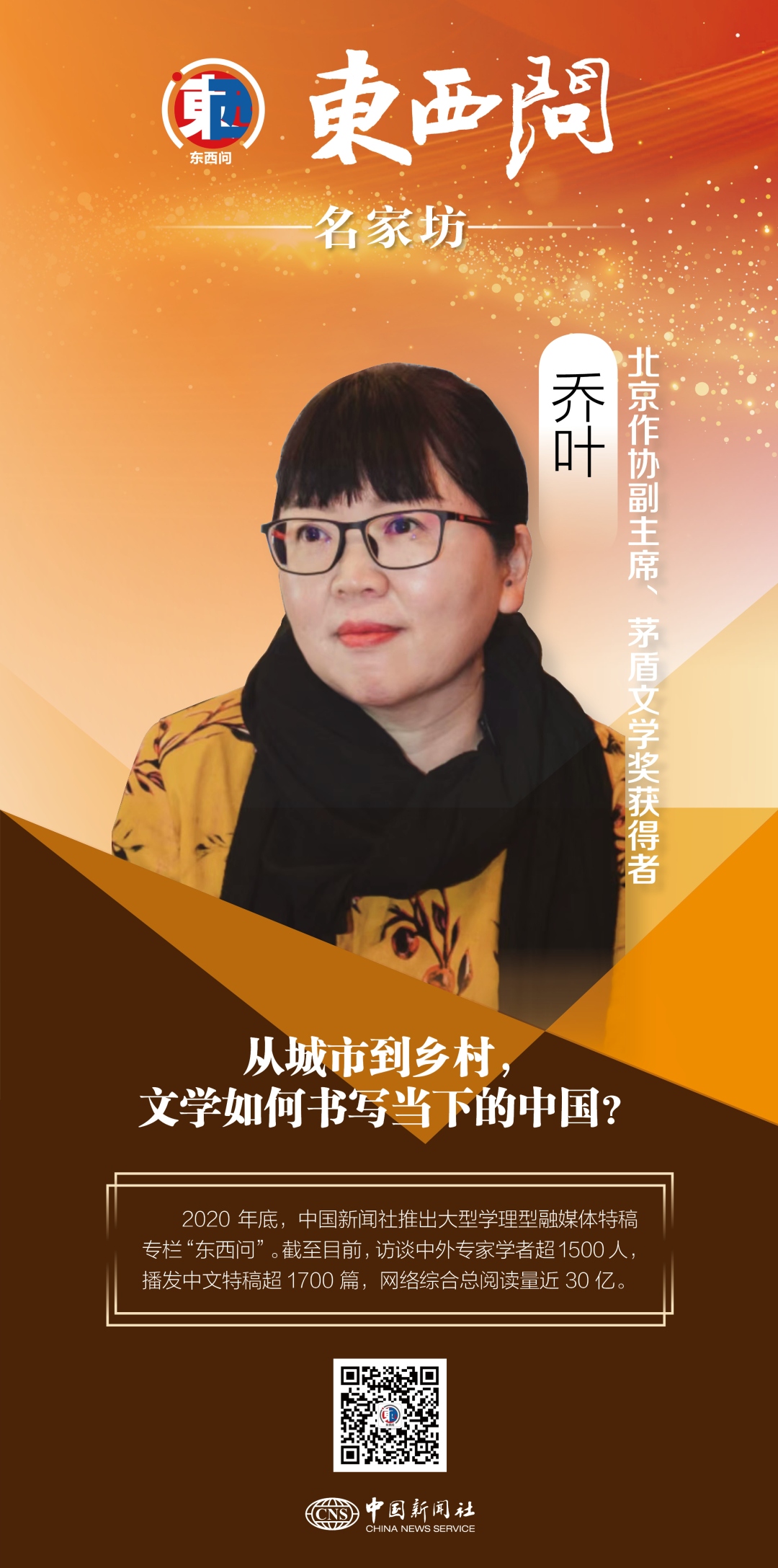 中新社“東西問”日前專訪喬葉,請她講述自己作為一位小說家如何看待文學(xué)對當(dāng)下中國的書寫,如何看待中國文學(xué)“走出去”的現(xiàn)狀。