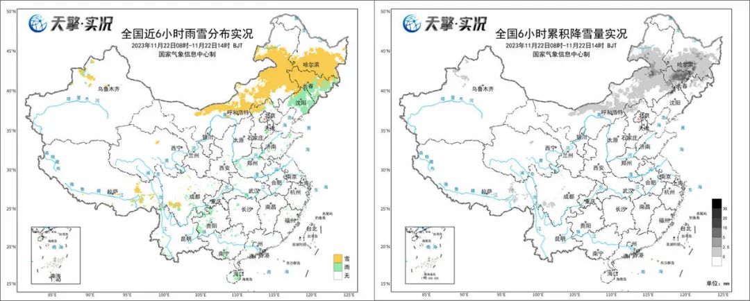 實況數(shù)據(jù)顯示,今天白天,內(nèi)蒙古中東部以及東北地區(qū)大部都出現(xiàn)了雨雪天氣,其中,內(nèi)蒙古中東部、黑龍江中南部一帶以降雪為主,吉林、遼寧等地以降雨為主;黑龍江最強降雪集中在哈爾濱,尚志6小時降雪量超10毫米,達到暴雪以上量級。