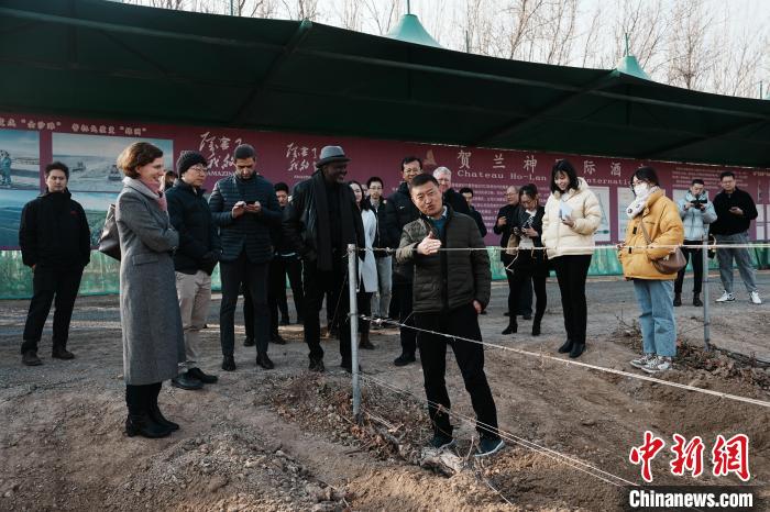 駐華使節(jié)、外交官和外國(guó)地方駐華機(jī)構(gòu)代表在賀蘭神酒莊了解葡萄藤埋土工作?!≈行戮W(wǎng)記者 崔楠 攝