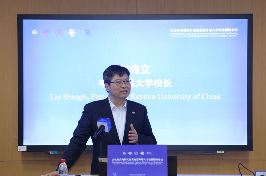 中國人民大學(xué)校長(zhǎng)林尚立在會(huì)議開幕式致歡迎辭。林尚立表示,文化外交與跨文化復(fù)合型外語人才培養(yǎng)是語言類學(xué)科的必要之舉,此舉對(duì)未來人類的發(fā)展會(huì)愈發(fā)彰顯其重要性。林尚立認(rèn)為,外語人才的培養(yǎng)應(yīng)該具有文化感、哲學(xué)感,同時(shí)要加深對(duì)世界文化的了解,要有世界眼光,希望外語專業(yè)能夠培養(yǎng)出一批真正具有家國情懷、人類情懷,同時(shí)也具有豐厚人文底蘊(yùn)的新一代文化人,培養(yǎng)出跨文化的文化外交者、跨文化的文化促進(jìn)者。