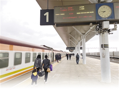 由中國路橋工程有限責(zé)任公司承建的蒙內(nèi)鐵路是肯尼亞獨立以來建設(shè)的首條鐵路,也是一條采用中國標(biāo)準(zhǔn)、中國技術(shù)、中國裝備建造的現(xiàn)代化鐵路,被譽為中國和肯尼亞共建“一帶一路”標(biāo)志性工程。圖為蒙內(nèi)鐵路列車??吭趦?nèi)羅畢站。