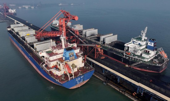 12月5日,兩艘輪船靠泊在唐山港曹妃甸港區(qū)國(guó)投曹妃甸港口有限公司煤炭碼頭裝貨(無人機(jī)照片)。新華社記者楊世堯攝