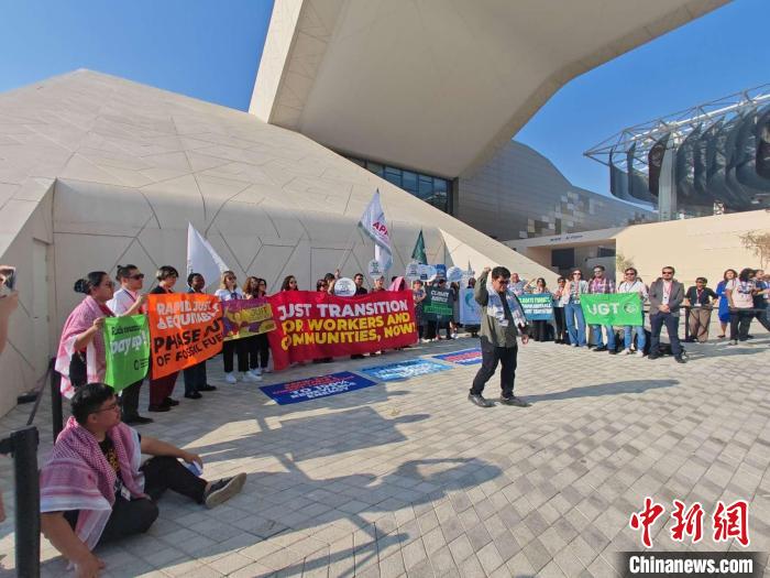 12月9日,阿聯(lián)酋迪拜,抗議者在聯(lián)合國氣候變化迪拜大會(huì)藍(lán)區(qū)會(huì)場(chǎng)集會(huì)并呼吁公正轉(zhuǎn)型?!≈行律缬浾?龐無忌 攝