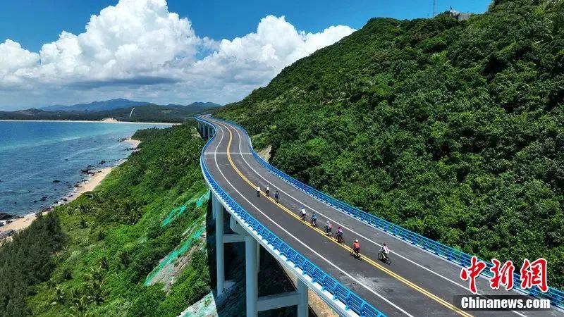 圖為海南環(huán)島旅游公路萬(wàn)門嶺大橋臨崖路段吸引游客騎行打卡。楊師忠 攝