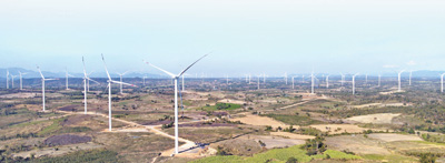 在越南中南部嘉萊省公則若縣縣城以西,數(shù)十座巨型風力發(fā)電機的葉片徐徐轉動,為當?shù)厣a(chǎn)生活供應源源不斷的電力。