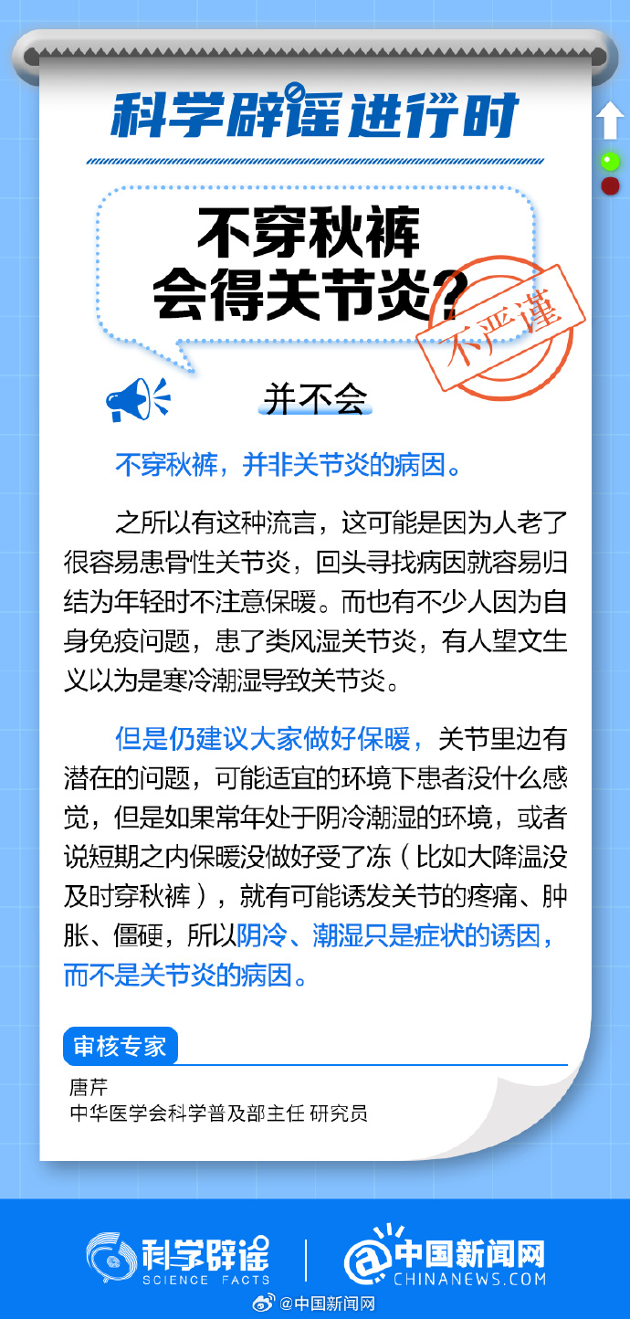 中新網(wǎng)12月11日電 不穿秋褲,并非關(guān)節(jié)炎的病因。之所以有這種流言,這可能是因?yàn)槿死狭撕苋菀谆脊切躁P(guān)節(jié)炎,回頭尋找病因就容易歸結(jié)為年輕時(shí)不注意保暖。而也有不少人因?yàn)樽陨砻庖邌?wèn)題,患了類風(fēng)濕關(guān)節(jié)炎,有人望文生義以為是寒冷潮濕導(dǎo)致關(guān)節(jié)炎。但陰冷、潮濕是疼痛、僵硬等關(guān)節(jié)炎癥狀的誘因(而不是病因),仍建議大家做好保暖。(來(lái)源:@科學(xué)辟謠 @中國(guó)新聞網(wǎng))