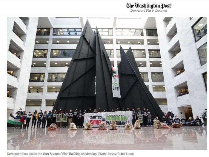 報(bào)道稱,抗議者身穿寫有“立即停止(援助)武器”字樣的黑色T恤,高喊“立即?;?!立即?;?!”。他們還舉著寫有“援助以色列=轟炸巴勒斯坦人”的條幅。