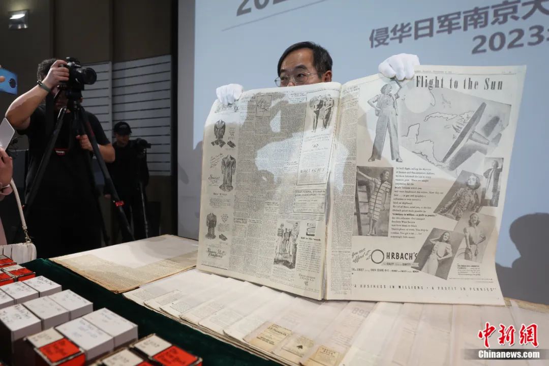 2023年12月8日,侵華日軍南京大屠殺遇難同胞紀(jì)念館舉行2023年新征文物史料新聞發(fā)布會(huì)。美籍華人魯照寧向媒體展示1937年12月6日出版的紐約時(shí)報(bào),報(bào)紙對侵華日軍進(jìn)攻南京做了詳細(xì)報(bào)道。泱波 攝