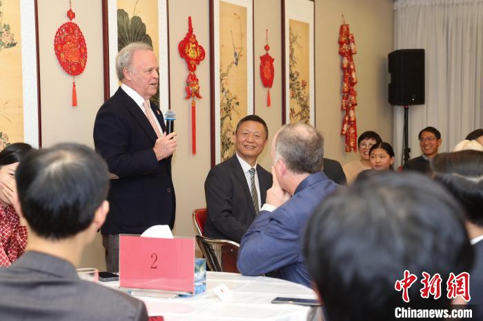 12月16日,加拿大白求恩醫(yī)學(xué)發(fā)展協(xié)會會長艾瑞特(站立者)在招待會上發(fā)言。中新社記者 余瑞冬 攝