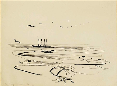 在人物肖像之外,萬徒勒里也熱衷于描繪中國(guó)山水。他于1954年創(chuàng)作的《長(zhǎng)江》借鑒了中國(guó)水墨丹青技法,整幅畫作視野開闊,體現(xiàn)出中國(guó)水墨畫的朦朧、婉約與詩(shī)意。他在客居瑞士期間的畫作同樣展現(xiàn)中國(guó)水墨畫開闊的構(gòu)圖、精巧的線條和獨(dú)具一格的東方美學(xué)。畫作《歸來》通過南飛的歸雁、孤寥的漁船和茫茫無盡的海面,讓觀者感受到一種難以訴諸語言、始終縈繞心頭的鄉(xiāng)愁。