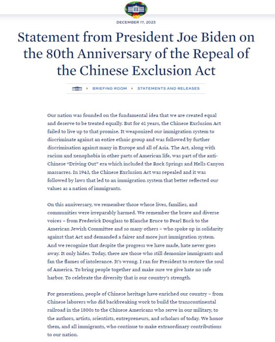 中新網(wǎng)12月18日電 綜合報道,當?shù)貢r間17日,美國總統(tǒng)拜登就廢除排華法案80周年發(fā)表文告。美國華人聯(lián)合會(UCA)會長薛海培表示,這是白宮141年來首次正式譴責排華法案的歷史性文件,這使得華人和亞裔社區(qū)追求平等待遇的歷史性努力又向前邁進了一大步。