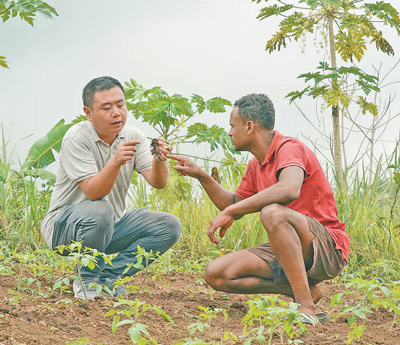 7月15日,在圣多美和普林西比洛巴塔縣卡德拉斯村,中國(guó)援圣普農(nóng)牧業(yè)技術(shù)專(zhuān)家組專(zhuān)家許州達(dá)在田間指導(dǎo)農(nóng)戶(hù)努內(nèi)斯種植辣椒。