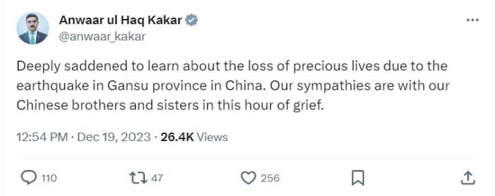 中新網(wǎng)12月19日電 綜合報(bào)道,12月18日,甘肅臨夏州積石山縣發(fā)生6.2級(jí)地震。19日,巴基斯坦總理卡卡爾在社交平臺(tái)上發(fā)帖稱,對(duì)中國(guó)甘肅省地震中失去的寶貴生命深感悲痛。
