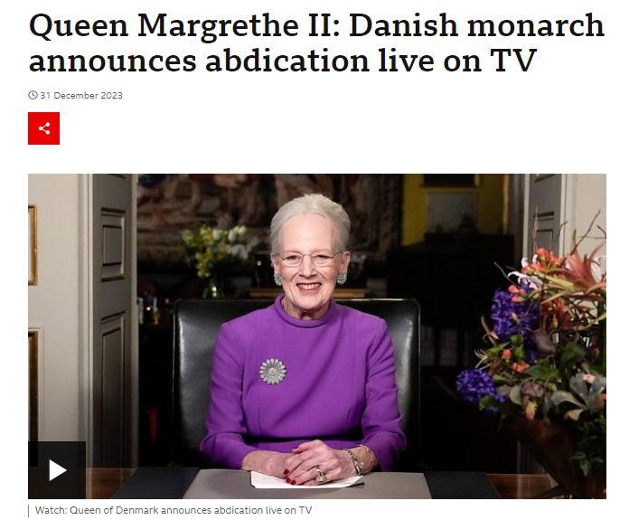 中新網(wǎng)1月1日電 綜合外媒報道,當(dāng)?shù)貢r間2023年12月31日,現(xiàn)年83歲的丹麥女王瑪格麗特二世在發(fā)表新年致辭時宣布,2024年1月14日是她登基52周年紀念日,屆時她將退位,把王位傳給其兒子腓特烈王儲。
