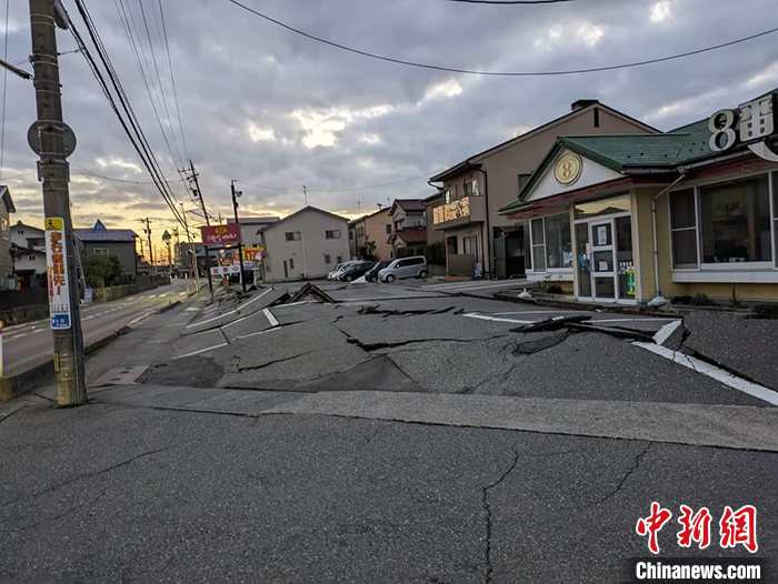 圖為1月1日,石川縣金澤市道路因地震導(dǎo)致龜裂受損。 中新社發(fā) 鐘欣 攝