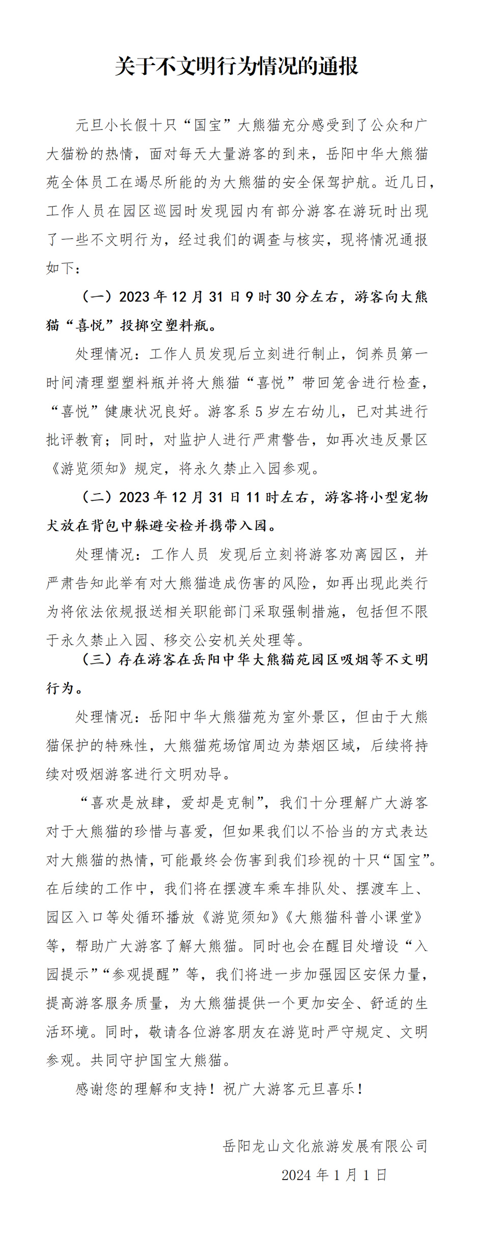 中新網(wǎng)1月2日電 據(jù)湖南省岳陽市南湖動物園有限公司官方微信消息,近幾日,工作人員在園區(qū)巡園時發(fā)現(xiàn)園內(nèi)有部分游客在游玩時出現(xiàn)了一些不文明行為,2023年12月31日9時30分左右,有游客向大熊貓“喜悅”投擲空塑料瓶。