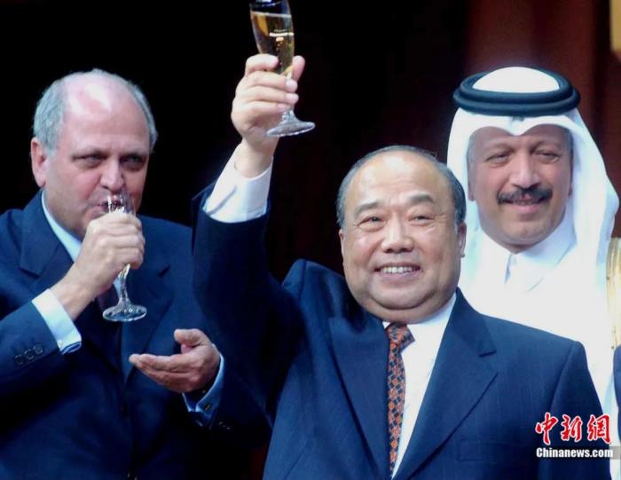 2001年11月12日,中國加入WTO議定書簽字儀式在卡塔爾首都多哈舉行,時任外經(jīng)貿(mào)部部長石廣生在簽字后同各國代表一起舉杯慶祝。錢興強 攝