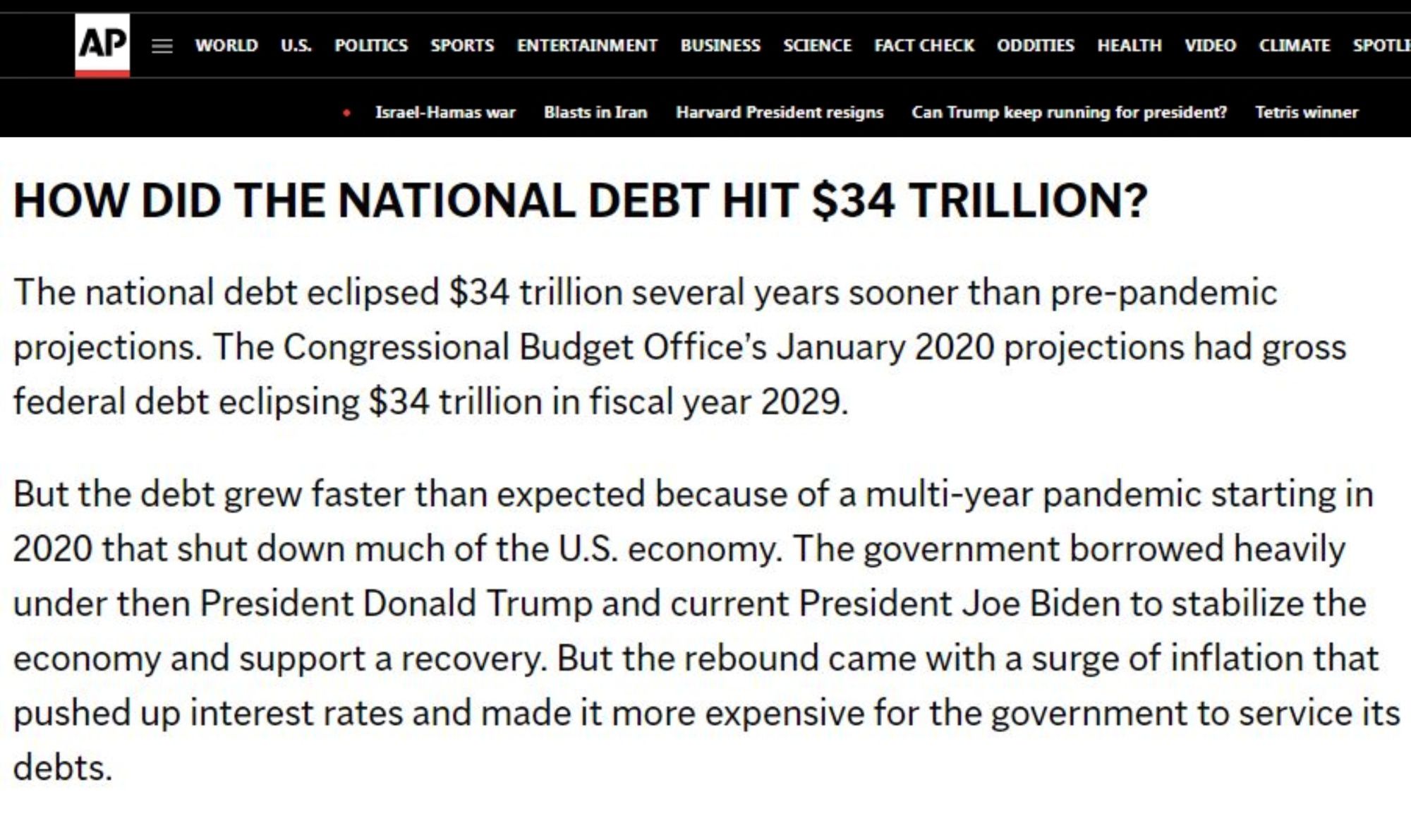 美聯(lián)社的報道指出,正是由于投資者長期以來愿意借錢給美國政府,后者才得以在不增加稅收的情況下持續(xù)花錢?!暗磥韼资甑膫鶆?wù)路徑可能會危及美國的國家安全和主要支出項目,包括社會保障和醫(yī)療保險”。