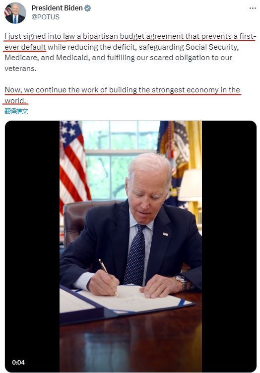 拜登當(dāng)時在社交媒體上寫道:“我剛剛簽署了一項兩黨預(yù)算協(xié)議,防止有史以來第一次債務(wù)違約……現(xiàn)在,我們將繼續(xù)建設(shè)世界上最強大的經(jīng)濟體?!?/p>