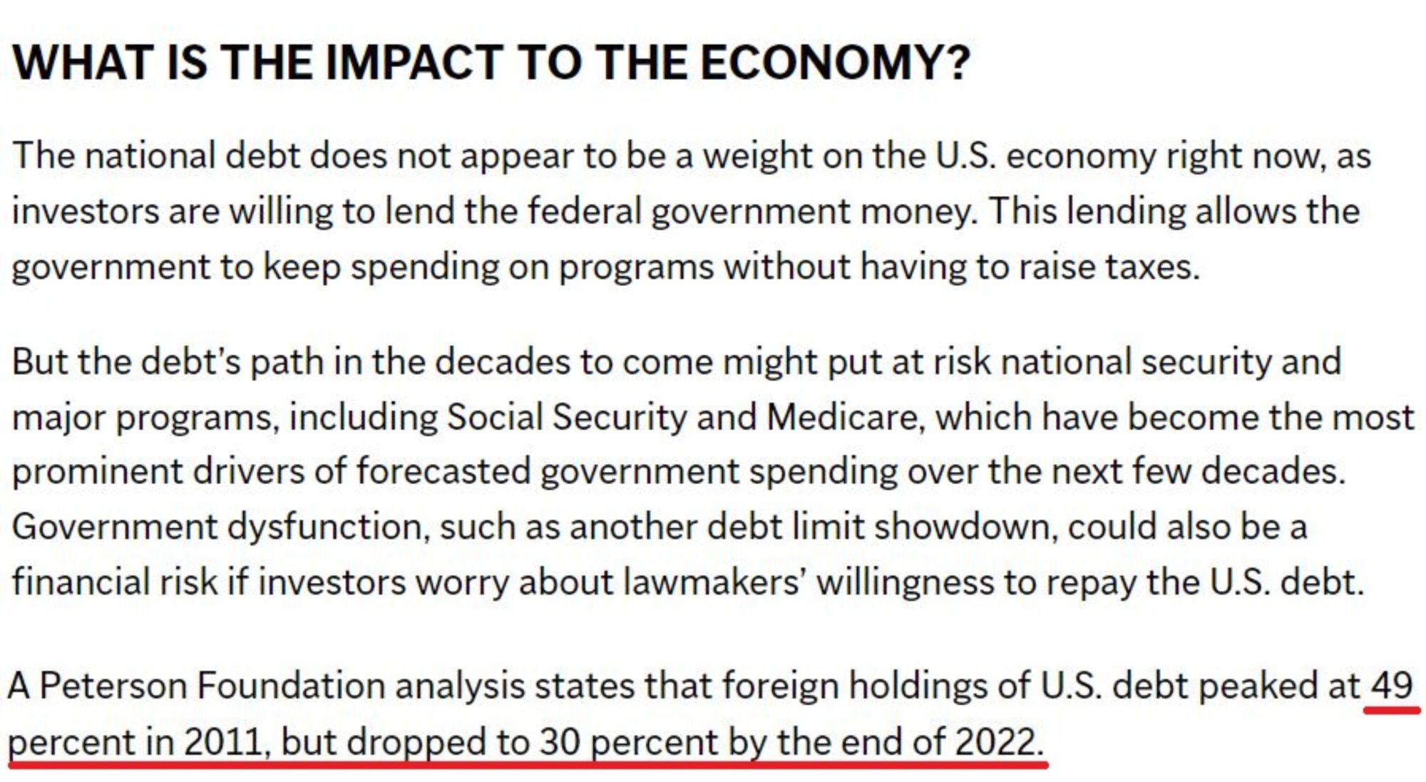 事實上,美國國會黨爭和政府功能失調(diào)引發(fā)的多次債務(wù)上限之爭和債務(wù)違約險情,已迫使國際買家紛紛減持美國國債。根據(jù)彼得森基金會的數(shù)據(jù),海外投資者所持美債份額在2011年曾達到49%的峰值,但到2022年底已降至30%。