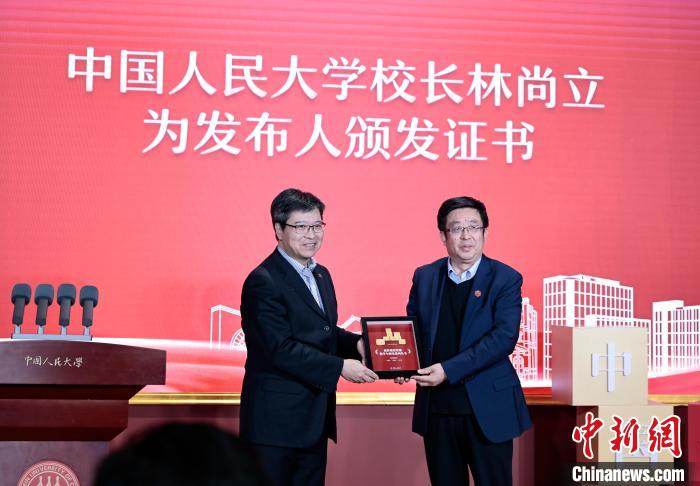 中國人民大學(xué)校長林尚立為本次活動(dòng)成果發(fā)布人頒發(fā)證書。