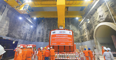 2023年6月10日,工人在巴基斯坦蘇吉吉納里水電站吊裝最后一臺機(jī)組轉(zhuǎn)子。