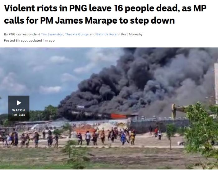報道稱,當(dāng)天晚間,數(shù)以千計(jì)的示威者涌上街頭,巴布亞新幾內(nèi)亞首都莫爾斯比港的商店和企業(yè)被縱火或洗劫,現(xiàn)場一片騷亂。