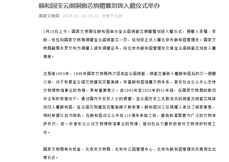 這是繼1993年、1995年國(guó)家文物局兩次促成寶云閣銅窗、銅窗芯重新入藏頤和園后的又一捐贈(zèng)義舉,對(duì)于恢復(fù)寶云閣文物建筑完整面貌、豐富頤和園館藏文物體系、激發(fā)社會(huì)公眾關(guān)心支持文物博物館事業(yè)的熱情,具有重要意義。自1993年至2024年的31年間,在國(guó)家文物局的殷切關(guān)注和積極推動(dòng)下,通過(guò)國(guó)內(nèi)外友好人士的捐贈(zèng),寶云閣歷史上失散流失的銅窗及銅窗芯陸續(xù)回歸入藏頤和園,寶云閣文物建筑完整面貌不斷恢復(fù)。頤和園對(duì)三位捐贈(zèng)人表達(dá)了誠(chéng)摯謝意,同時(shí)希望以此為契機(jī),在頤和園對(duì)公眾開放110周年來(lái)臨之際,宣揚(yáng)和凝聚更為廣泛的文物保護(hù)共識(shí),進(jìn)一步激發(fā)公眾對(duì)文物博物館事業(yè)的熱情,推動(dòng)社會(huì)力量積極參與文物保護(hù)利用工作。