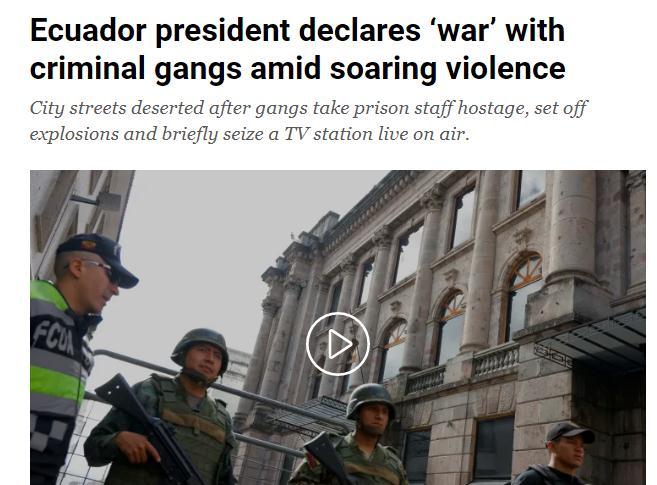 近來(lái),該國(guó)各地發(fā)生了一系列暴力事件,造成至少10人喪生。此外,該國(guó)一家電視臺(tái)遭武裝人員闖入,多所監(jiān)獄發(fā)生騷亂,數(shù)名警察遭到綁架,“頭號(hào)通緝犯”、犯罪集團(tuán)“Los Choneros”頭目馬西亞斯則在獄中失蹤。