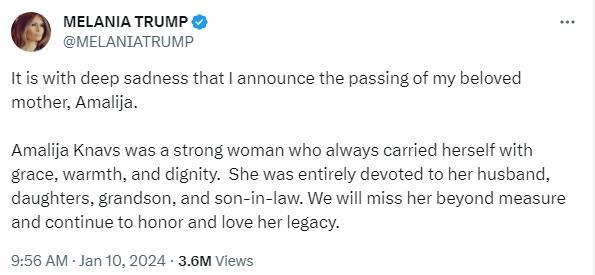 當(dāng)天晚些時候,特朗普也在社交媒體上發(fā)文稱,“這對整個特朗普家族來說是一個非常悲傷的夜晚!梅拉尼婭偉大而美麗的母親阿瑪利加,剛剛?cè)チ颂炜罩幸粋€美麗的地方。她是一個令人難以置信的女性,我們對她的懷念難以言表!”此外,他還貼出了自己與岳母的合影舊照。