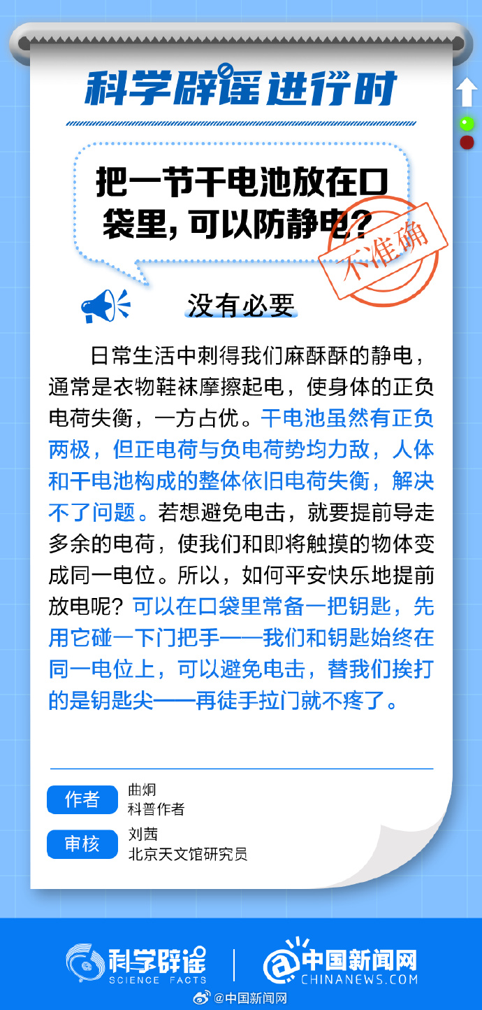 中新網(wǎng)1月11日電 干電池雖然有正負(fù)兩極,但正電荷與負(fù)電荷勢(shì)均力敵,人體和干電池構(gòu)成的整體依舊電荷失衡,解決不了問(wèn)題。若想避免電擊,就要提前導(dǎo)走多余的電荷,使我們和即將觸摸的物體變成同一電位。所以,如何平安快樂(lè)地提前放電呢? 可以在口袋里常備一把鑰匙,先用它碰一下門(mén)把手。(來(lái)源:@科學(xué)辟謠 中國(guó)新聞網(wǎng))