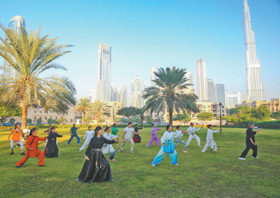 每到周末,世界最高建筑——阿聯(lián)酋迪拜哈利法塔附近的草坪上,一群身穿中式練功服的民眾排成隊(duì)列,伴著舒緩的中國(guó)古典民樂,起勢(shì)、野馬分鬃、白鶴亮翅……如今,越來越多民眾自發(fā)前來學(xué)習(xí)太極拳、太極劍、太極扇等,經(jīng)常性參加太極拳練習(xí)活動(dòng)的就有來自50多個(gè)國(guó)家和地區(qū)的近200人。