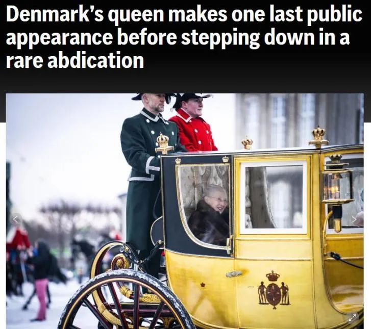 當(dāng)?shù)貢r間1月4日,是丹麥女王瑪格麗特二世最后一次以君主身份公開露面?,F(xiàn)年83歲的女王乘坐“金馬車”穿過丹麥?zhǔn)锥迹簧倜癖娒爸鴩?yán)寒、強風(fēng)和雨雪,在沿途為她揮舞旗幟并歡呼。