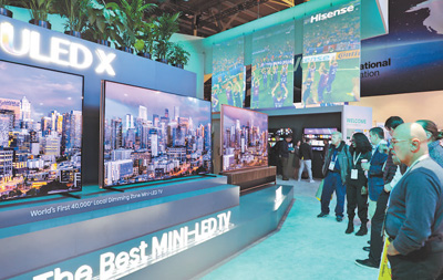 海信攜全球首款8K屏幕發(fā)聲激光電視、全球首款40000+分區(qū)Mini LED電視——110UX電視等全場景顯示技術(shù)解決方案亮相展會(見上圖,本報記者李志偉攝)。在110UX電視展品前,很多人駐足觀看,高清畫質(zhì)不時獲得稱贊。獲得“2024 CES創(chuàng)新獎”的海信車用激光顯示技術(shù),展示了激光顯示在車載領(lǐng)域的潛力。海信國際營銷公司副總裁戴維·戈爾德對記者表示,海信致力于將顯示技術(shù)融入生活,為消費者提供超越屏幕的體驗,讓其成為生活的一部分。