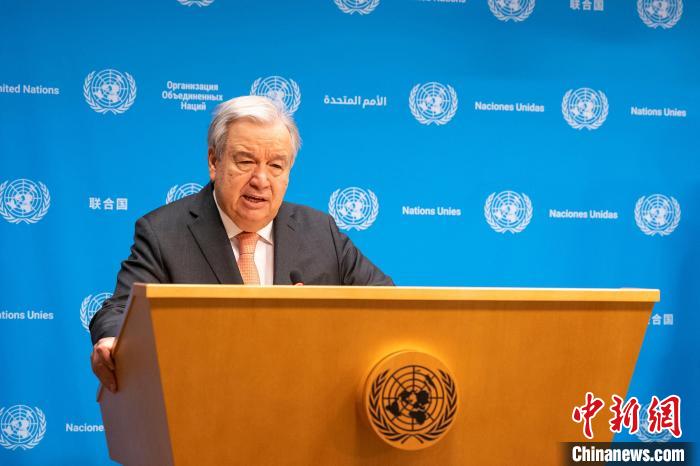 當?shù)貢r間1月15日,聯(lián)合國秘書長古特雷斯在紐約聯(lián)合國總部向媒體發(fā)表講話,再次呼吁立即在加沙地帶實現(xiàn)人道主義?;稹!≈行律缬浾?王帆 攝