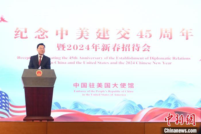 當(dāng)?shù)貢r(shí)間1月16日,中國駐美國使館舉辦紀(jì)念中美建交45周年暨新春招待會。圖為中國駐美大使謝鋒致辭。中新社記者 陳孟統(tǒng) 攝