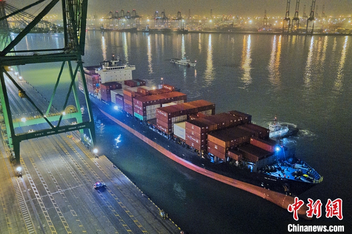 1月16日晚,裝載著2500余噸智利車厘子的大型集裝箱班輪“巴赫”號,順利抵達天津港太平洋國際集裝箱碼頭,標志著天津港與南美洲直航的首條“車厘子快線”正式開通?!败嚴遄涌炀€”始發(fā)于智利圣安東尼奧港,直抵天津港。未來一周,還將有2艘次智利車厘子貨船抵達天津港,累計8300噸車厘子及其他南美洲產(chǎn)品從天津港上岸。(無人機照片) 中新社記者 佟郁 攝