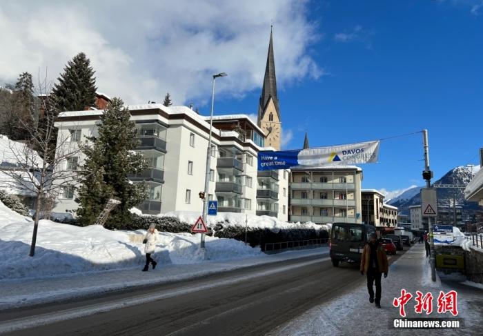 資料圖:當(dāng)?shù)貢r(shí)間1月15日,達(dá)沃斯街道上掛起會(huì)議相關(guān)景觀裝飾。
