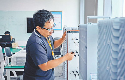 在泰國最大移動運營商AIS和中興(泰國)通信公司聯(lián)合創(chuàng)建的AIS—ZTE聯(lián)合創(chuàng)新中心內(nèi),泰國工作人員在對通信設備進行檢修調(diào)試。