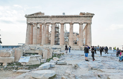 近期,希臘雅典衛(wèi)城山頂?shù)呐撂剞r(nóng)神廟迎來大量游客。