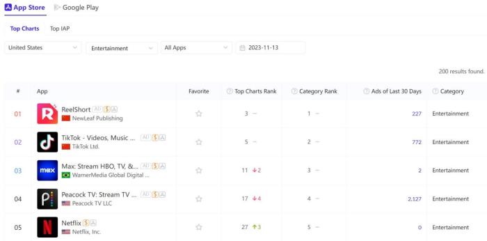 這些出海短劇雖“土”,卻在2023年國(guó)產(chǎn)應(yīng)用軟件賽道闖出一片天。據(jù)AppGrowing統(tǒng)計(jì),ReelShort已經(jīng)成為全球短劇市場(chǎng)的頂級(jí)產(chǎn)品,其母公司股價(jià)持續(xù)上漲。