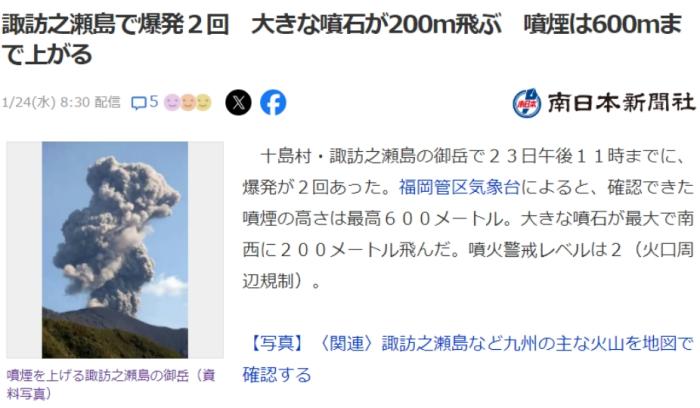 福岡管區(qū)氣象臺(tái)發(fā)布消息稱(chēng),噴出的煙柱最高達(dá)600米,巨大的火山石向外飛出200米。目前,當(dāng)?shù)匾呀?jīng)將火山噴發(fā)警戒提高到2級(jí),火山口周邊區(qū)域禁止入內(nèi)。