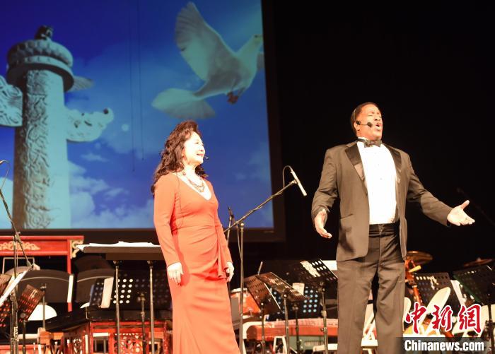 當(dāng)?shù)貢r(shí)間1月27日晚,以紀(jì)念中美建交45周年為主題的鷹飛龍騰新年音樂會(huì)在美國(guó)洛杉磯唱響。圖為中美兩國(guó)歌唱家聯(lián)袂演唱《我愛你中國(guó)》?!≈行律缬浾?張朔 攝