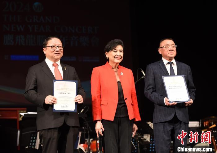 當(dāng)?shù)貢r(shí)間1月27日晚,以紀(jì)念中美建交45周年為主題的鷹飛龍騰新年音樂會(huì)在美國(guó)洛杉磯唱響。圖為美國(guó)聯(lián)邦眾議員趙美心(中)向美國(guó)鷹龍傳媒董事長(zhǎng)蘇彥韜(左)等主辦方代表頒發(fā)賀狀。 中新社記者 張朔 攝