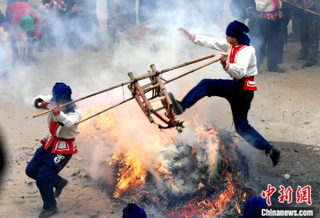 年輕小伙扛著棕轎,輪流沖撞火堆