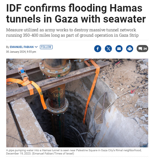 以軍表示,并非所有的哈馬斯地道都會被注入海水淹沒。以軍還稱,在向地下隧道注水之前,會進行“專業(yè)和全面”的檢查,以確保地下水不受污染。