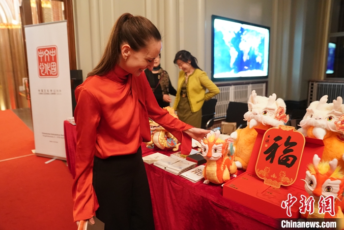 柏林中國(guó)文化中心還在現(xiàn)場(chǎng)設(shè)置了文化展臺(tái),向來(lái)賓展示來(lái)自中國(guó)的精美文創(chuàng)藝術(shù)品和文化旅游推廣品,龍年的“吉祥龍”深受來(lái)賓喜愛。